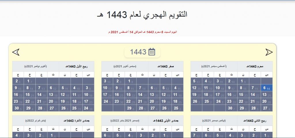 إليكم التقويم الهجري لعام 1443 ، وهو التقويم الذي يحرص المسلمون في جميع أنحاء العالم على معرفته، نظرًا لأن هذا التقويم يتضمن الكثير من المناسبات الدينية مثل شهر رمضان وعيد الفطر وعيد الأضحى ومولد النبي والهجرة النبوية، وتتكون السنة الهجرية من 12 شهرًا تبدأ بشهر محرم، وهناك طريقتين للتعرف على موعد بداية هذا الشهر، الأولى هي الطريقة الرسمية حيث يُعرف بداية الشهر من خلال استطلاع هلاله، والثانية وهي الطريقة الاسترشادية والتي تعتمد على الحسابات الفلكية في معرفة بداية السنة الهجرية الجديدة، وفي سطور هذا المقال على موقع مخزن سنعرض تقويم السنة الهجرية 1443.