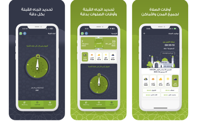 تطبيق بوصلة واتجاه القبلة وأوقات الصلاة متوفر في تطبيقات أبل ستور من أفضل التطبيقات التي تساعد في تحديد اتجاه القبلة الدقيق وأوقات الصلاة الصحيحة لجميع مدن العالم. ويتضمن التطبيق إشعارات الأذان، وتحكم في الإعدادات القابلة للتخصيص، ويتمتع التطبيق بتقييمات عالية وواجهة سهلة الاستخدام. ومتاح باللغتين الإنجليزية والعربية. ومن مميزات التطبيق: