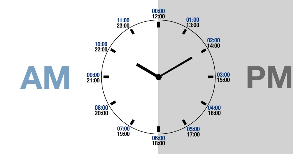 من الساعة 0:01 حتى الساعة 11:59 يكون هذا الوقت هو وقت قبل الظهر أي Am أما الساعة : 12:00 ويعني منتصف النهار أو منتصف الظهر أما من الساعة 12:01 حتى الساعة 23:59 يكون الوقت بعد الظهر ويوضع بجانبه Pm 24:00 أو 00:00 ويعني منتصف الليل.